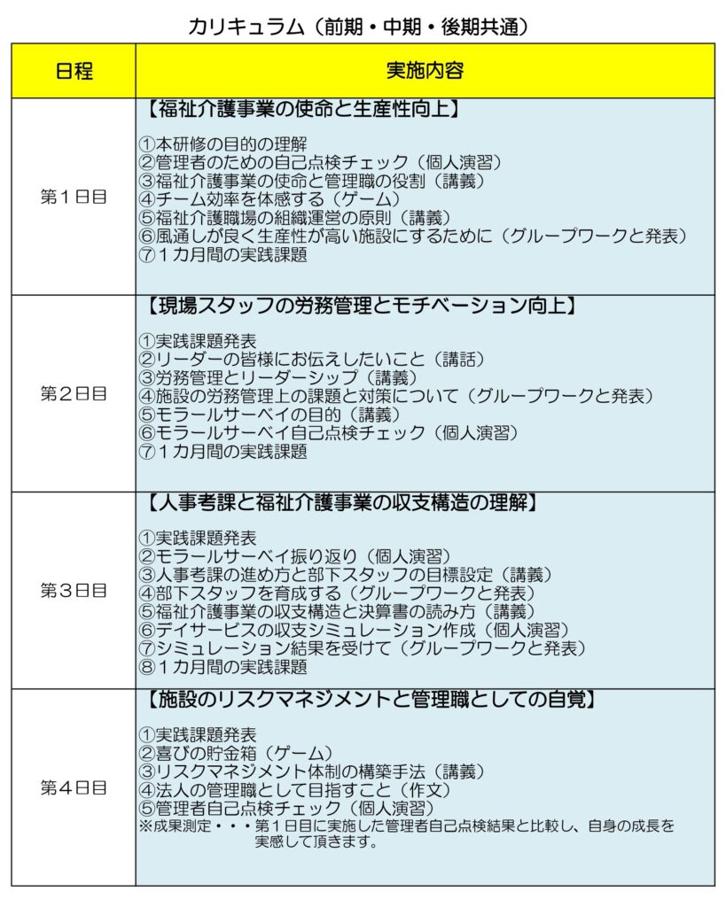 ②法人施設に対する帰属意識と職場での一体感を醸成できるように組み立てています。よって、1法人につき、原則4名以上でお申し込みください。どうしても対象者が4名集められない場合は、ご相談に応じます。申し込み時にお気軽にご相談ください。
